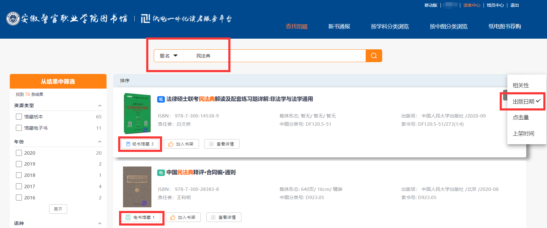 3.检索结果界面中,可以按照“相关性”等方式对结果进行排序,点击红框内的纸书/电书馆藏可查看该书在图书馆内的具体信息,方便读者到馆借阅纸书或在线阅读电子书。