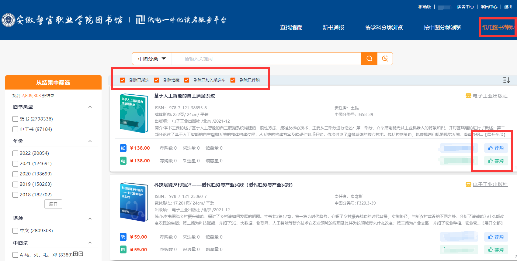 1.点击“纸电图书荐购”进入荐购页面,默认对“剔除已采选”、“剔除馆藏”等选项进行勾选,根据读者需求选择“荐购”纸书或“荐购”电子书。