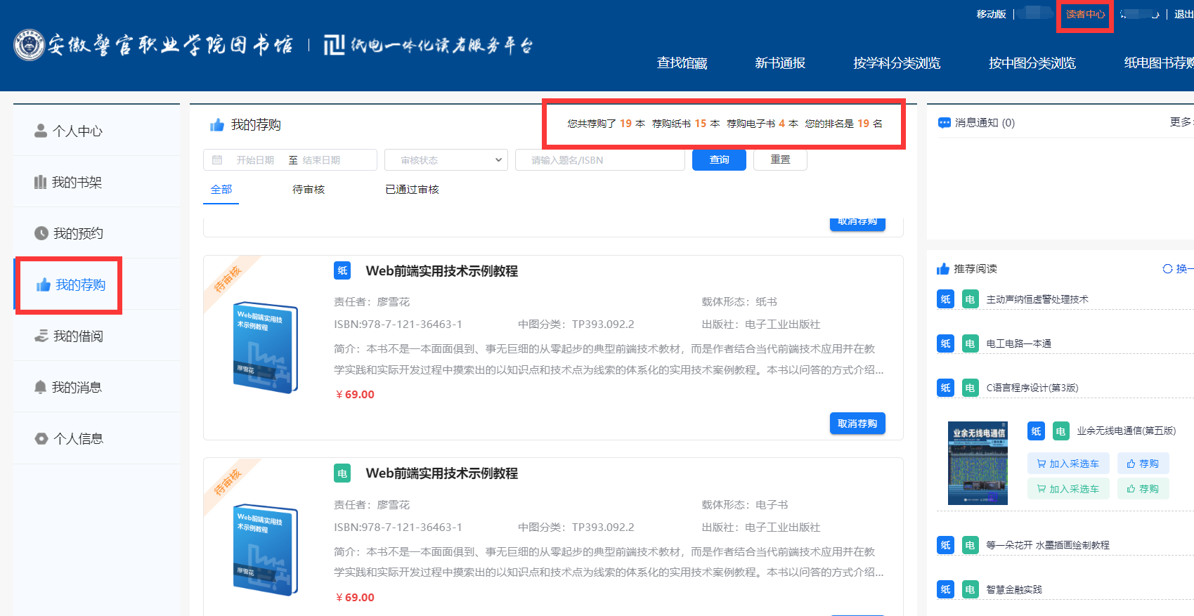 2.点击“读者中心”,进入“我的荐购”界面,即可查询个人荐购情况。