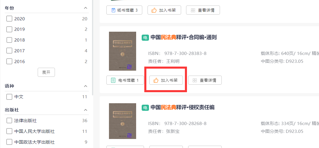 4.检索到的图书可以“加入书架”,随后在“读者中心”栏目下的“我的书架”进行查阅。