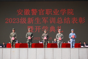 汇演结束后,蒋红旗宣读军训表彰决定,与会领导为队列优胜连、内务优胜寝室、优秀教官和训练标兵代表颁奖。教师代表公共管理系朱瑜老师、新生代表警察系行政执行刘柳同学分别上台发言。