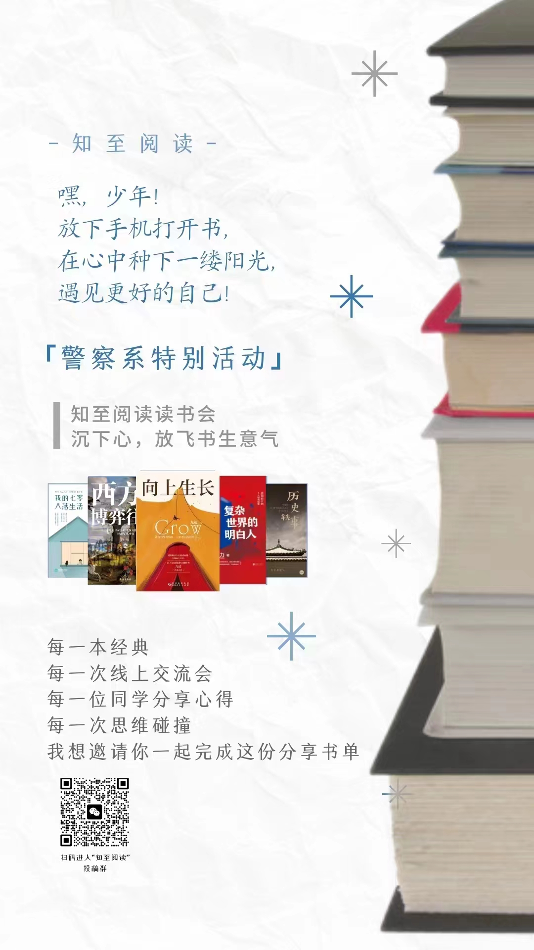 为营造阅读氛围,养成阅读习惯,警察系团总支宣传部、学生会学习部自2023年12月起,在“安徽警院警察系”微信公众号上面向全体师生,推出“知至阅读”读书分享专栏。稿件内容是一本正在阅读的枕边书,包括书名、作者及推荐的理由,分享书中最喜欢的一段文字。稿件要求为原创作品,内容健康,鼓励以“警”字为特色;体现训词精神,贴合校园实际生活。活动对投稿发表者发放精美纪念品。
