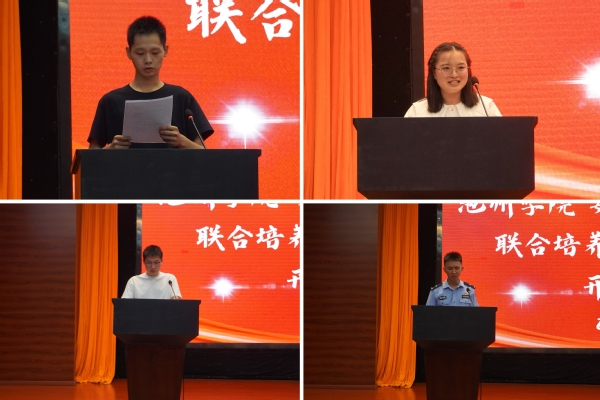 典礼上,丁震飞同学代表2024级全体新生表示将以积极进取的心态和勇敢的精神去迎接即将到来的全新警校生活;2023级学生代表张升领、施滢霞为新生介绍了学院良好的学习环境,分享了学习感悟;学院还邀请了联合培养2024届即首届毕业生、池州市石台县公安局民警李荣飞同志作为优秀校友代表发言,李荣飞对母校的栽培表达了深厚的感激之情,并用自己的求学和工作经历鼓励各位同学在未来的道路上扬帆信风做实事,脚踏实地写人生。