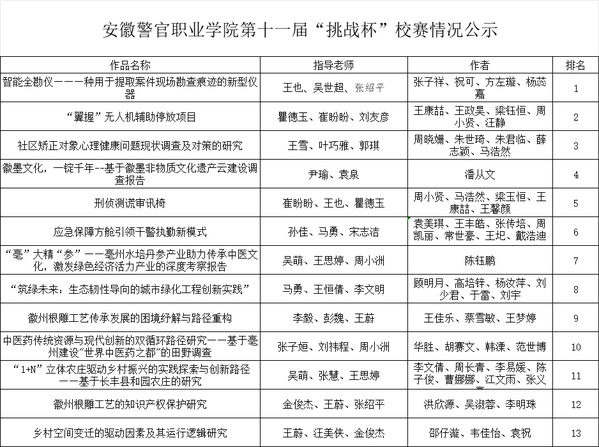 根据《第十一届“挑战杯·华安证券”安徽省大学生课外学术科技作品竞赛通知》的要求,现将我院推报省赛作品公示如下:
