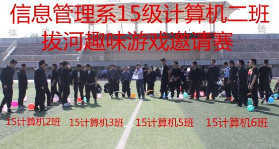 发扬团队精神,增强班级凝聚力,促进各班级之间的交流、丰富同学们的兴趣生活,2016年4月18日下午,15计算机二班,邀请了15计算机三班、15计算机五班、15计算机六班。在学院体育场举行了一场别开生面的拔河比赛和兴趣游戏活动。我们还邀请了联系班级领导,后勤集团任建伟书记,系领导学生科老师和班主任。