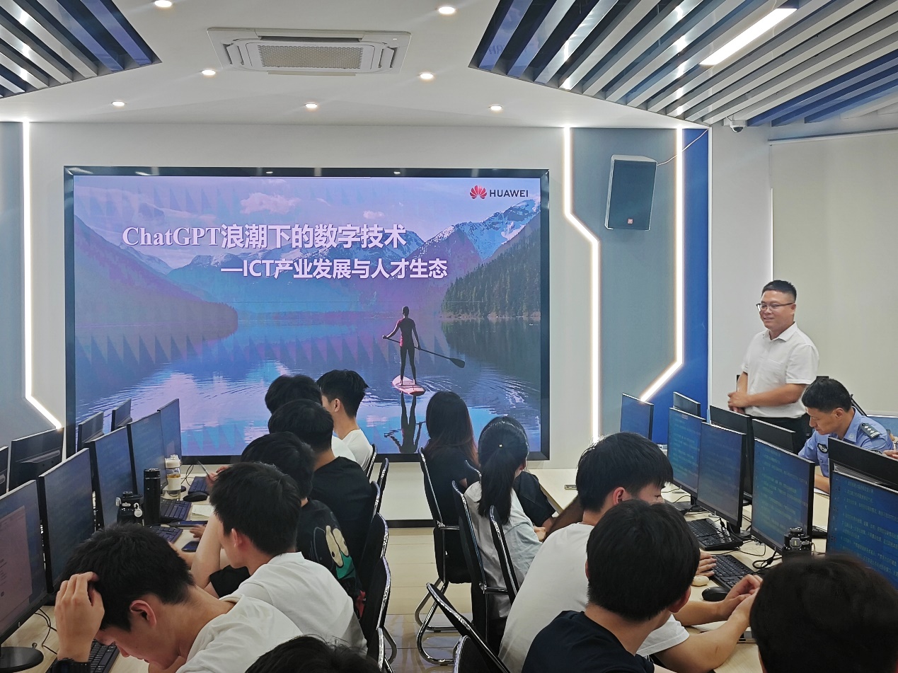 6月19日下午,信息管理系举办了一场主题为《ChatGPT 浪潮下的数字技术—ICT产业发展与人才生态》的讲座,特邀浙江华为通信技术有限公司华为云计算HCIE高级讲师李洪臣开讲,信息管理系23级网络工程(专升本)班49名同学及相关专业学生代表参会。讲座由网络工程专业负责人王宏群主持。