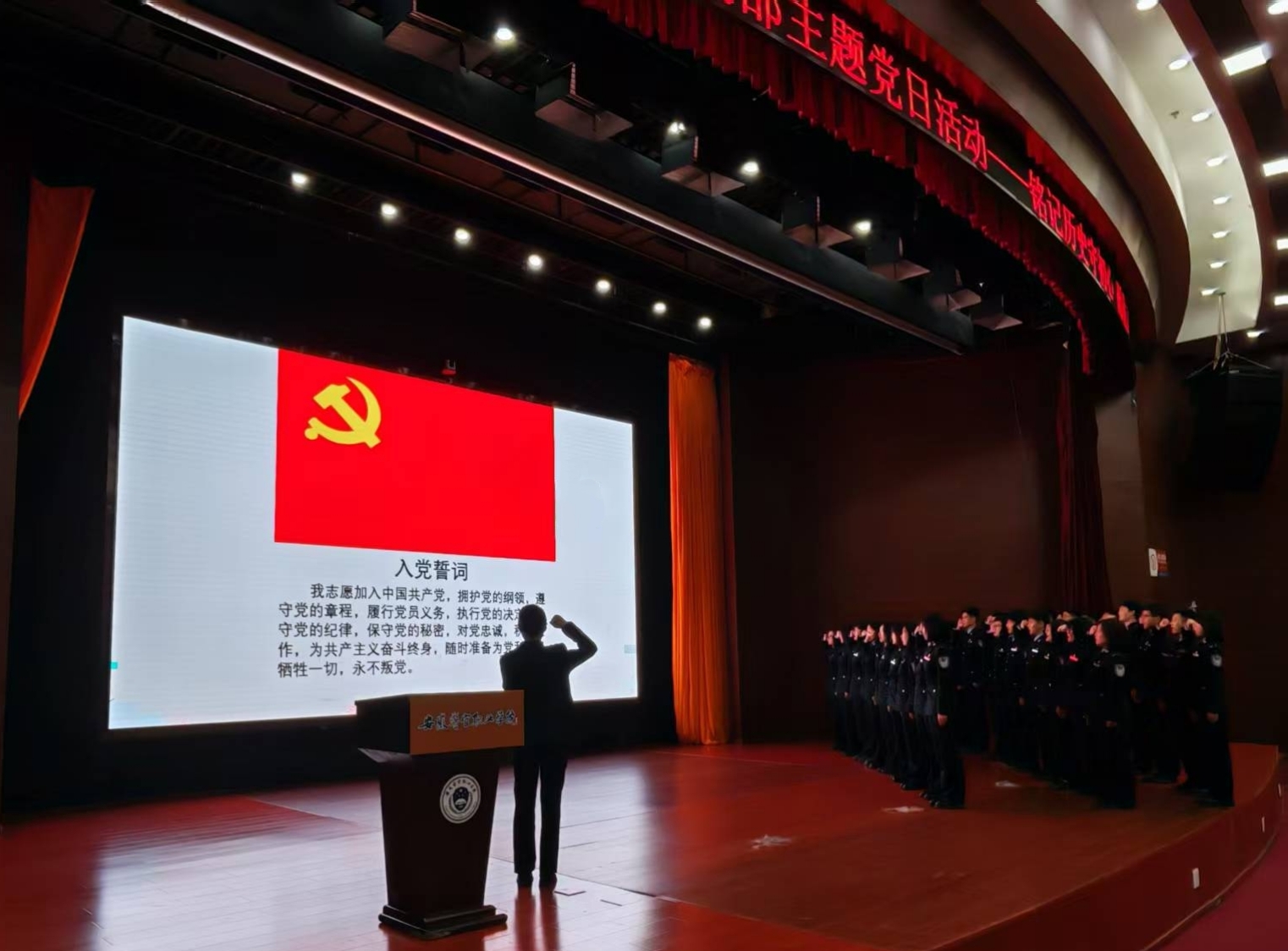 伴随着激昂的《中华人民共和国国歌》,党员教师程柏乔作为领誓人,带领预备党员举起右拳,面向党旗庄严宣誓,铮铮誓言铿锵有力,彰显新党员坚定的理想信念。