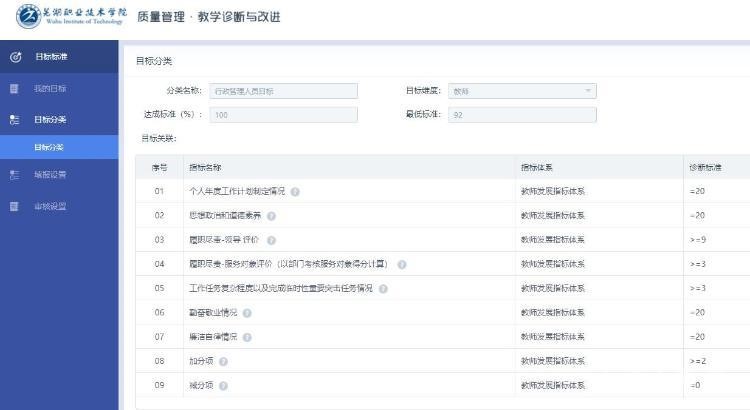 建立“三个一”。建立一个教师评价模型,包括师德师风、执教能力、教研能力、科研实践能力四个维度;建立一个教师发展标准,分为教授、副教授、讲师、助教四级;设计教师目标一张表,教师制定目标操作简便。教师年度目标分为专职教师(如图5)和行政人员(如图6)两类,教师目标与教师分级基本绩效关联,实现不同级别教师年度绩效管理,诊改周期结束系统自动生成教师诊改报告。