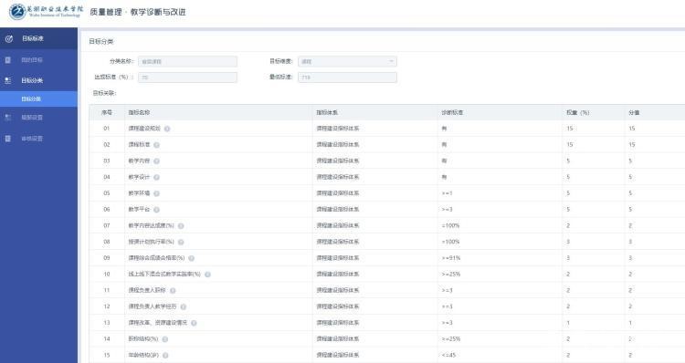 在课程建设层面,建立“四个一”。根据学校“十三五”发展规划,建立一个“十三五”课程建设规划;建立一个课程评价模型,包括课程教学实施、课程教学团队、课程影响力、课程评价四个维度;建立一个课程建设标准,分为国家级课程、省级课程、校级课程、普通课程四级;设计课程目标一张表,老师制定目标操作简便,诊改周期结束系统自动生成课程诊改报告。各课程负责人对照标准确立专业建设任务,根据目标诊断分析实时看到成果和差距,对于未达成目标的进行自我分析诊断改进。(如图4)