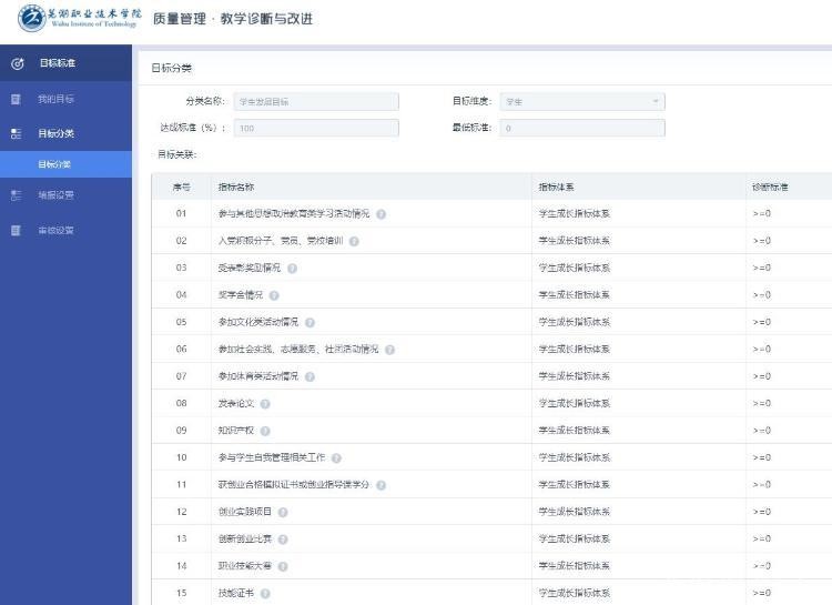 体系设计方面,从学校、专业、课程、教师、学生五个维度制定规划目标,细化标准,做到有逻辑起点、有可度量标准、有过程监控预警、有成果数据、能闭环运行、可智能化平台支撑,呈现出“8”字螺旋循环改进,体现了现代质量文化特征。希望通过指标体系的不断优化、评价体系的逐步认可,探索绩效考核、激励等制度改革,推动学校高质量发展。