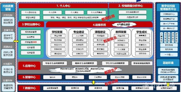 学校确立了基于大数据的数据中心为支撑的智慧校园建设方案,制定了学校数据标准体系和数据治理方案,确保各层面数据互通。通过将体系设计融入固化到平台,化繁为简,在为师生提供便捷的信息化服务中生成数据、生成质量,提升师生体验和获得感。(如图9)
