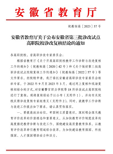 近日,省教育厅发布《安徽省教育厅关于公布安徽省第三批诊改试点高职院校诊改复核结论的通知》(皖教秘高〔2023〕57号),我院顺利通过安徽省高职诊改专家委员会专家组复核,复核结论为“有效”。在去年底专家组来院复核中,学院在学校层面、课程层面、学生层面、引擎驱动、平台建设顶层设计等五个方面取得了“显效”的优异成绩,获得专家组的高度肯定和一致好评。