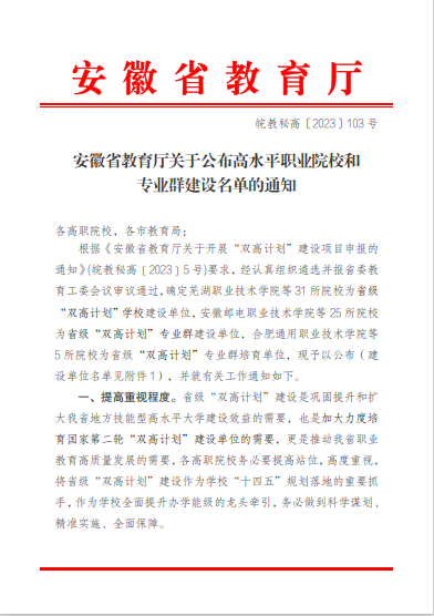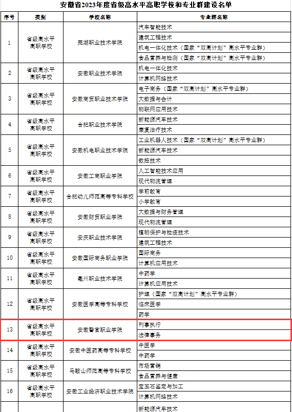 2023年8月3日,安徽省教育厅公布《安徽省教育厅关于公布高水平职业院校和专业群建设名单的通知》(皖教秘高﹝2023﹞103号),我院成功入选省级“双高计划”学校建设单位,刑事执行和法律事务两个专业群获批立项省级“双高计划”专业群。