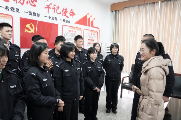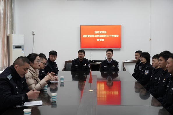 专题宣讲前,刘晓妮来到学院信息管理系,参加团员青年学习宣传贯彻党的二十大精神座谈会,与警院青年学生进行面对面互动交流,分享自己关于党的二十大精神的深刻体会、参会见闻以及基层工作经历,并现场解答学弟学妹们提出的有关问题。刘晓妮在交流中勉励警院青年们要勇于担当时代重任,把自身远大理想同党的路线方针结合起来,脚踏实地、磨练本领、埋头苦干,在全面建设社会主义现代化国家新征程上拿出新时代青年人的朝气、勇气、志气、底气,挺膺担当,激扬青春,在全面建设社会主义现代化国家新征程上唱响青春之歌。