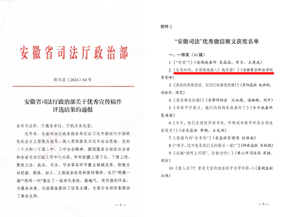 近日,为表扬先进,进一步提升宣传水平,树立精品意识,安徽省司法厅政治部部署开展2023年度优秀宣传稿件评选活动。经各单位初评推荐、省厅组织专家评审,30篇稿件分获“安徽司法”优秀微信推文一、二、三等奖。其中我院组织宣传处教师李家峰作品《生死时刻,女孩跪地救人!她是谁?》荣获“安徽司法”优秀微信推文一等奖。
